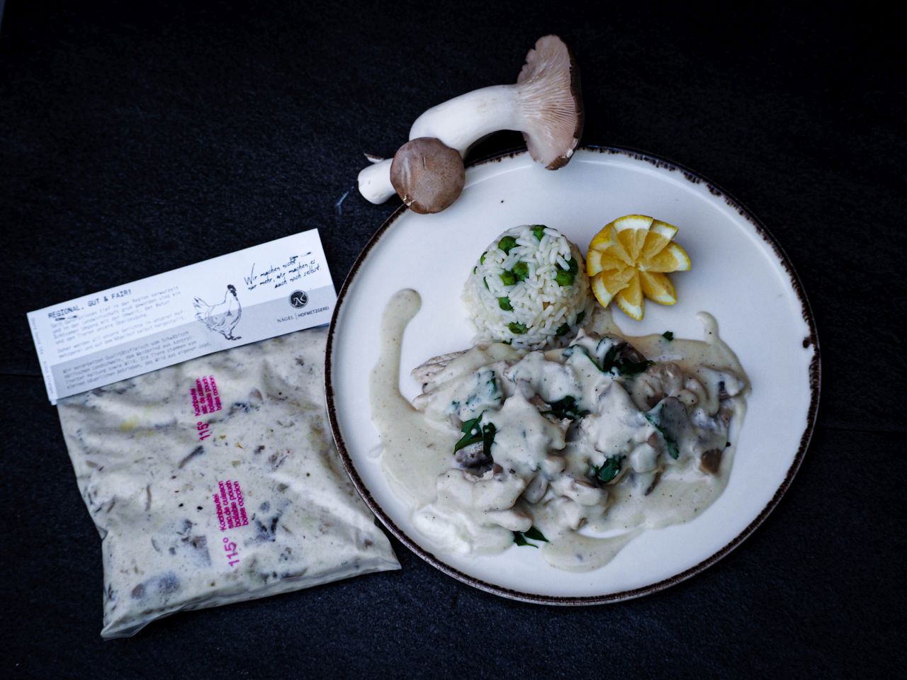 Zartes Hähnchenfleisch, fein abgeschmeckt in einer cremigen Champignon-Sahnesauce Zubereitung: Wasser zum Kochen bringen. Beutel in das kochende Wasser legen. Topf von der Platte nehmen und gemäß Zeit auf der Packungsbeilage im heißen Wasser ziehen lassen.