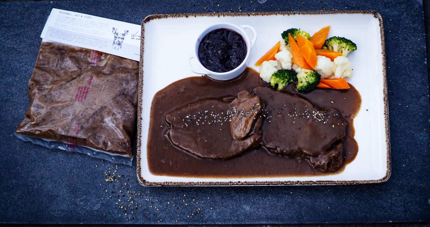 Dass die Franken einen besonders guten Sauerbraten machen, ist bekannt.  Wir verwenden dazu Fleisch von glücklichen, fränkischen Angus-Rindern, die auf natürlichen Weiden bei uns am Nägelhof aufgewachsen. Zubereitung: Wasser zum Kochen bringen. Beutel in das kochende Wasser legen. Topf von der Platte nehmen und gemäß Zeit auf der Packungsbeilage im heißen Wasser ziehen lassen.