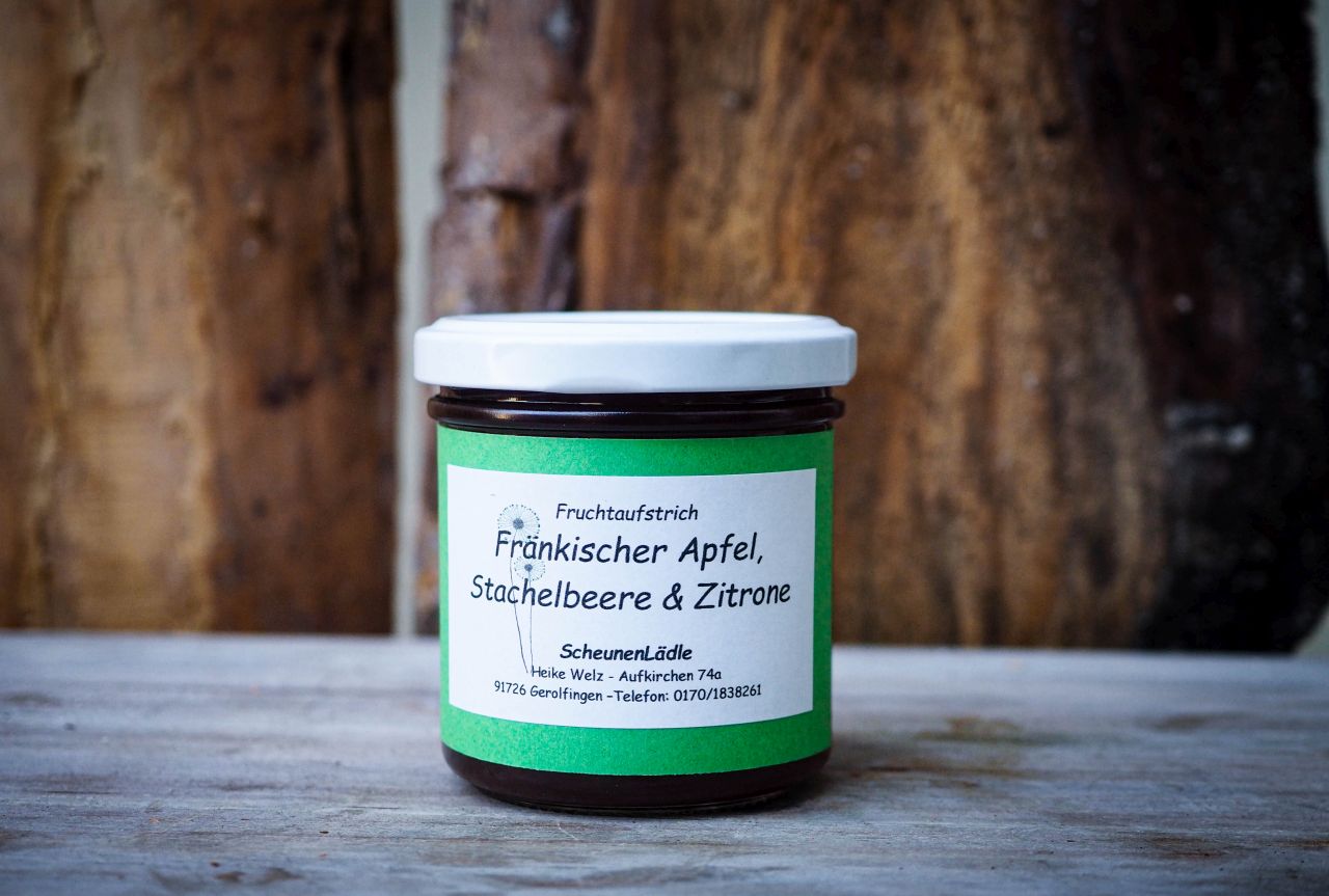 Leckerer Fruchtaufstrich mit Apfel und Stachelbeere von der hauseigenen Streuobstwiese. Ob auf´s Brot, Brötchen oder Croissant – immer ein Genuss.