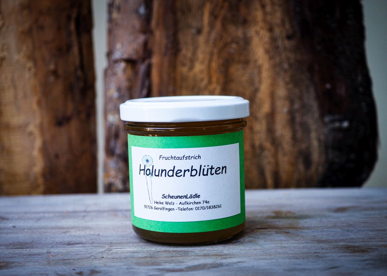 Leckerer Fruchtaufstrich mit Holunderblüten von der hauseigenen Streuobstwiese. Ob auf´s Brot, Brötchen oder Croissant – immer ein Genuss.