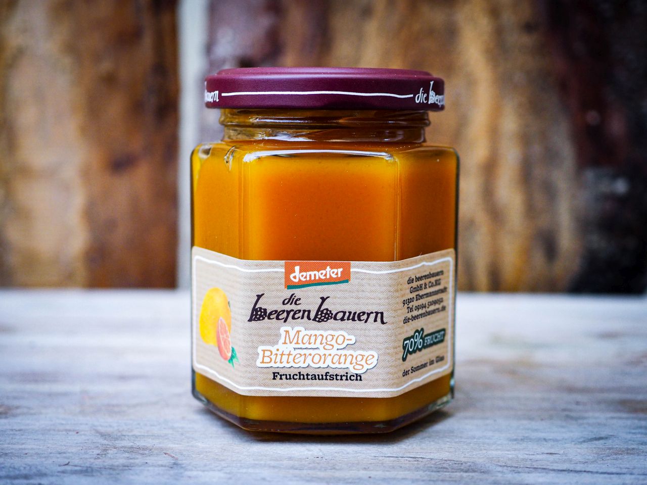 Das Mangopüree ist hergestellt aus der Sorte „Alphonso“, der Königin unter den Mangos, aromatisch und erlesen. Zu diesem Mangopüree mischen die beerenbauern eine Spur Bitterorangensaft, der dem Fruchtaufstrich im Abgang eine fruchtig herbe Note verleiht.