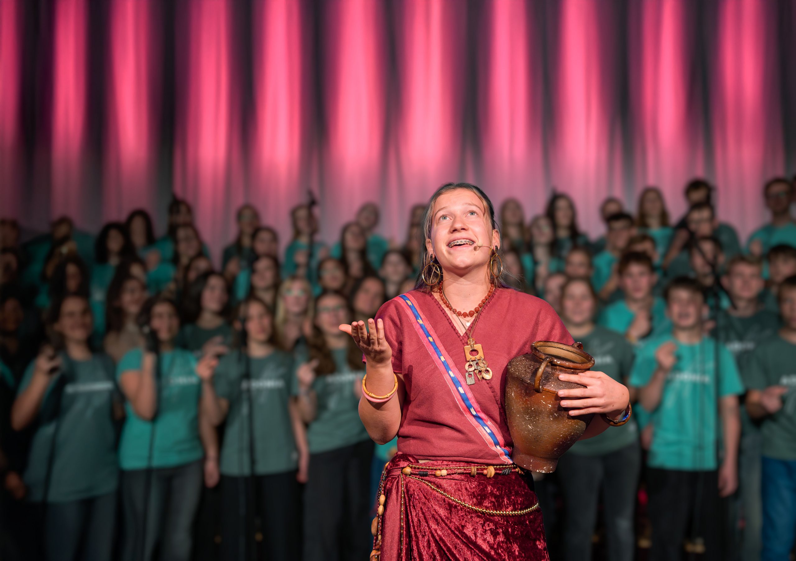 Theater und Tanz, eine coole Projektband und ein großer Chor – das ist Adonia. Die 70 Mitwirkenden haben sich für ein sogenanntes Musicalcamp angemeldet und vor zwei Monaten Album und Noten des Musicals erhalten, um die Lieder bereits zuhause zu üben. In einem intensiven Probecamp wird das 90-minütige Programm einstudiert. Und das Ergebnis ist erstaunlich: Die Jugendlichen sind nicht nur hoch motiviert und begabt, ihre Auftritte begeistern auch durch eine hohe Professionalität.